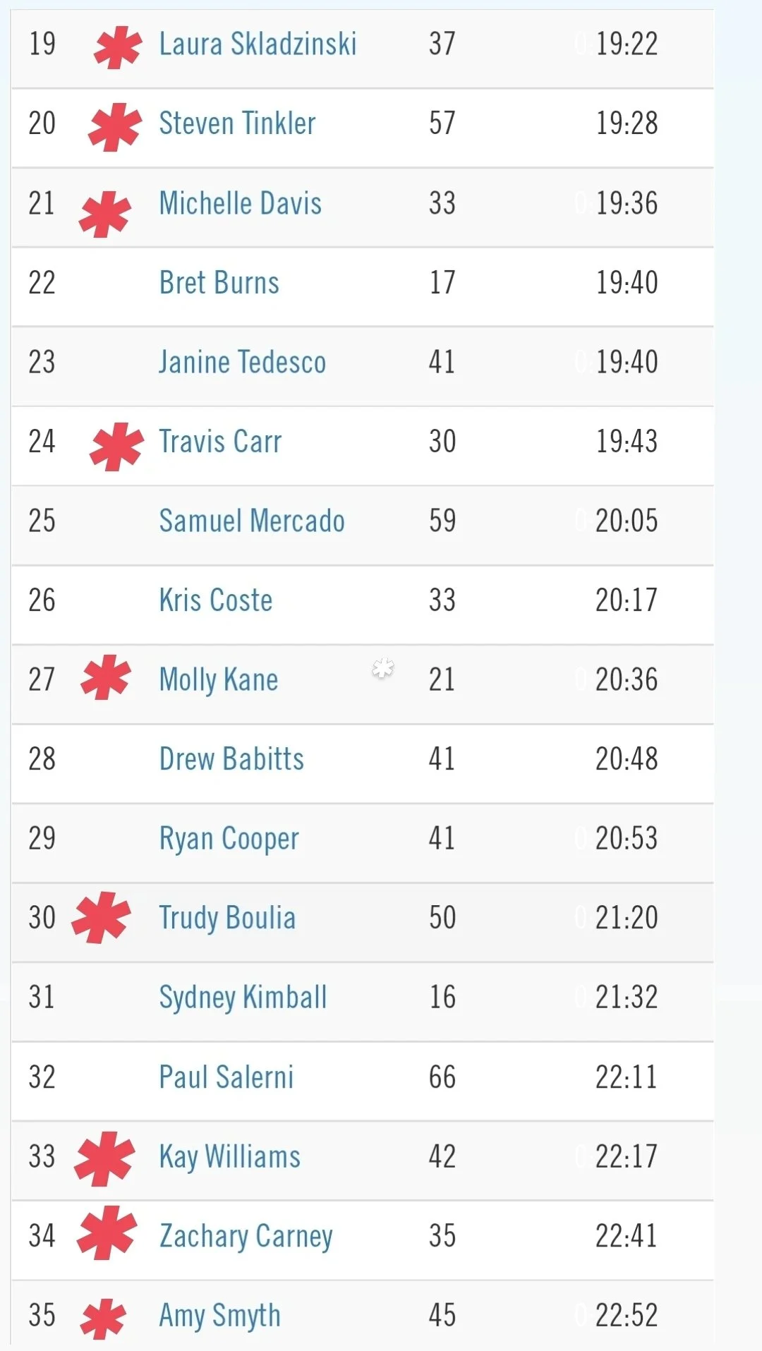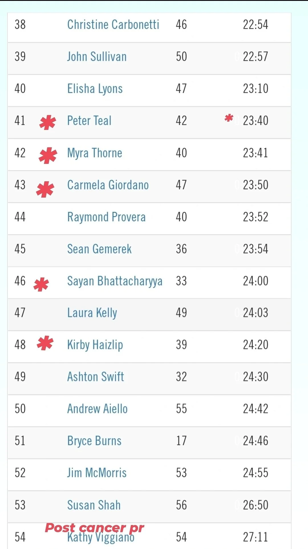 It’s very rare to see a race that produces almost half of the field with new personal bests. This is especially true in warmer weather when temperatures are higher, humidity is elevated, and 60+ dew points. The race went off at 8:00am with a field of fifty-eight athletes of the seventy-one registered. Of those participants we saw a PR percentage of around 45%. Of the runners that we can verify there were roughly twenty-five NEW PR’s set in the full group of 58 runners. Kathy Viggiano secured her post cancer PR of 27:11 and Christine Carbonetti ran her fastest 5k in five years with her 22:54. Kay Williams got her new mark at 22:17 and Peter Teal continued to improve all the way down to 23:40.